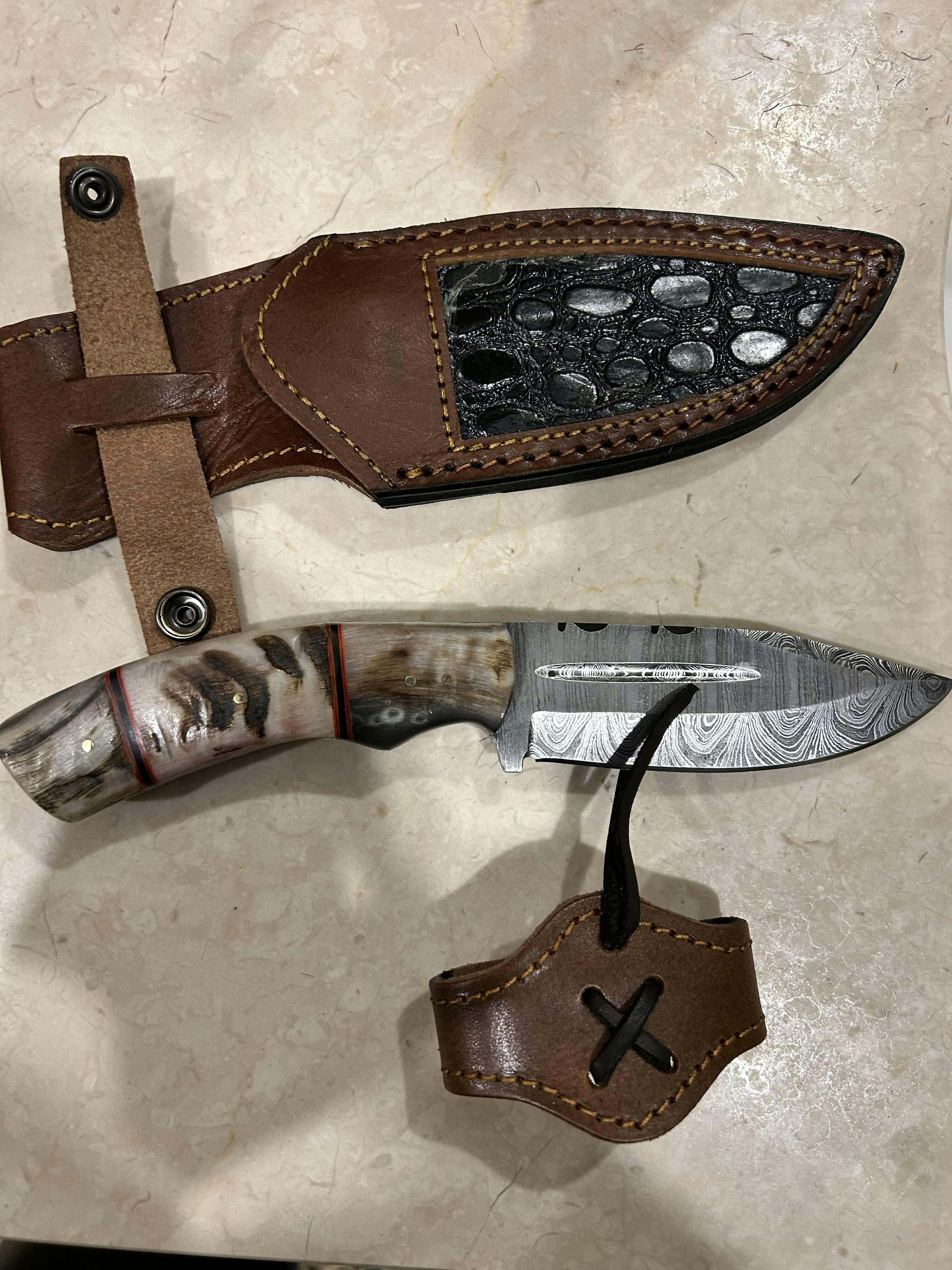 Experience the perfect blend of craftsmanship and functionality with this custom handmade hunting knife. Featuring a 5-inch Damascus steel blade, it offers exceptional sharpness and durability for outdoor adventures. The 9.5-inch overall length ensures a comfortable grip, while the sheep horn handle provides a natural, ergonomic feel. Comes with a premium leather sheath for safe carrying and storage.